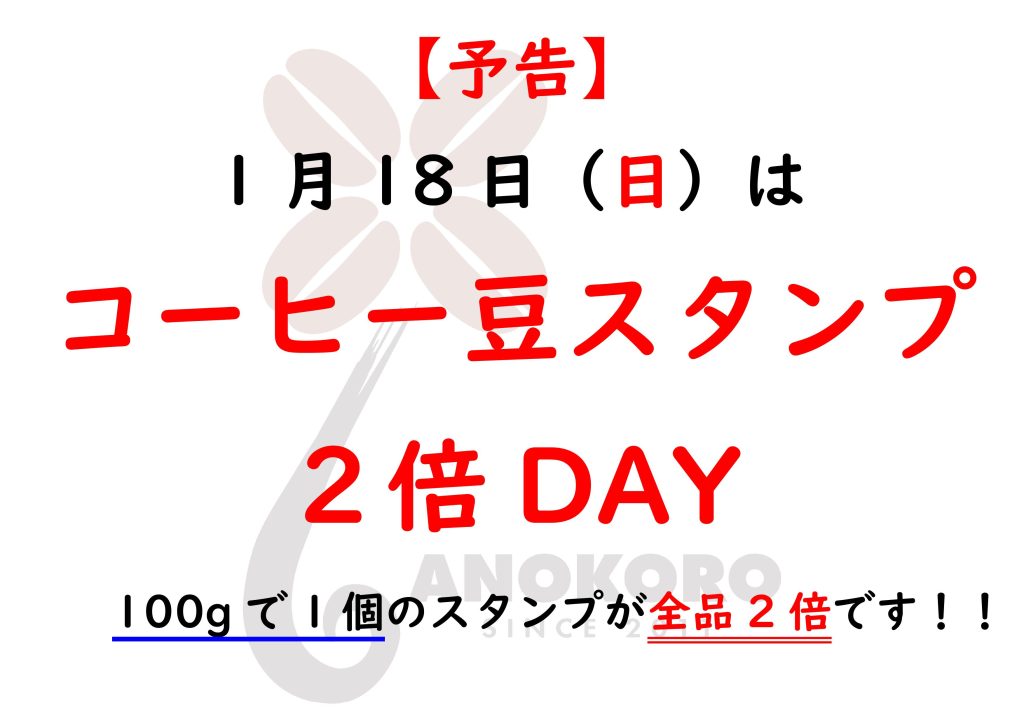 1月のスタンプ2倍DAYご案内です 2026年1月14日 infoお知らせ 毎度ご来店ありがとうございます。2026年最初のスタンプ2倍DAYは1月18日(日)です。気温の上下が激しい今年の1月温かいコーヒーでリラックスして上手に体温調節してください。